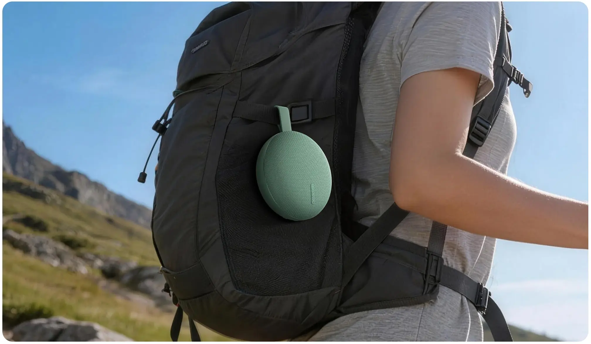 Колонка создана с прицелом на использование вне помещений. Ее вес составляет всего около 200 грамм — примерно как одно яблоко, что делает ее удобной для переноски в одной руке или в небольшой сумке.