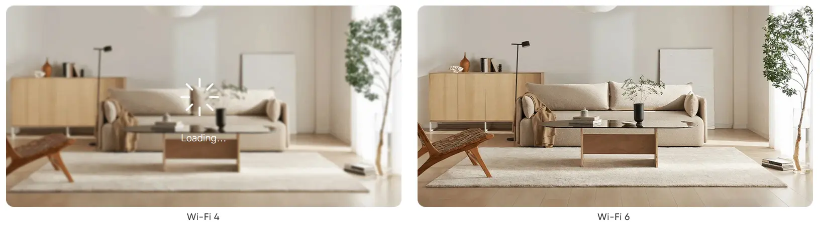 Подключение к сети обеспечивается через двухдиапазонный Wi-Fi 6 (2,4 и 5 ГГц) с поддержкой OFDMA и сниженной задержкой, что делает потоковую передачу видео более стабильной и надёжной.
