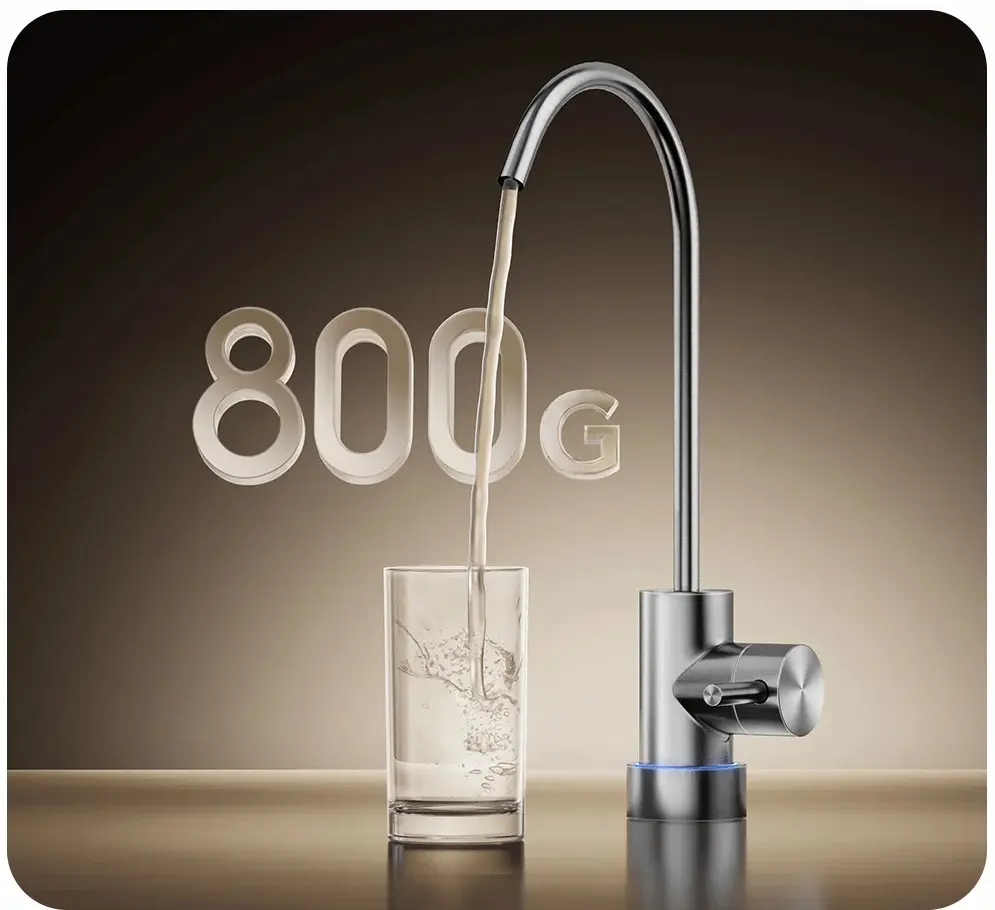 Система рассчитана на значительный объём очищенной воды, что позволяет удовлетворить нужды семьи с повышенным потреблением. На сайте производителя указано: модель обладает скоростью фильтрации до 800 G (примерно 2 л/мин) — что заметно снижает время ожидания.