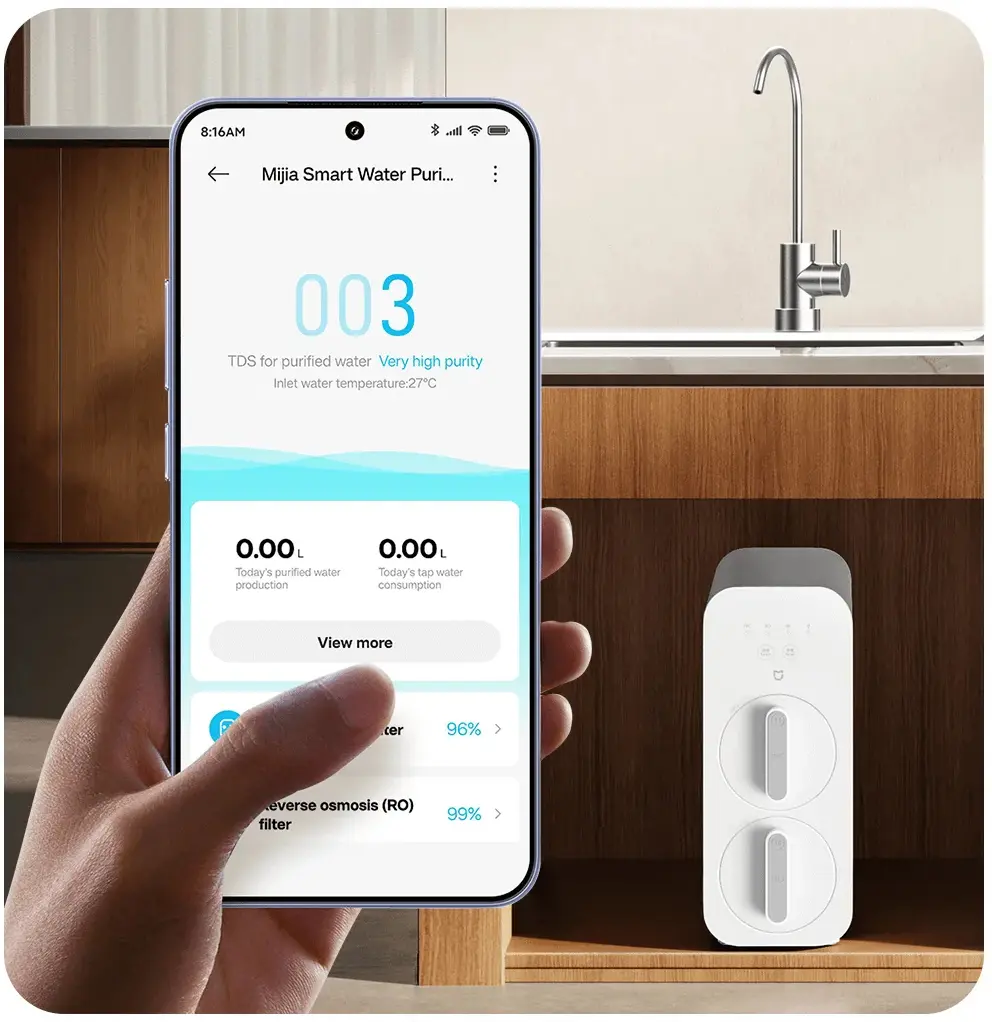 Помимо этого, устройство подключается к приложению Xiaomi Home, через которое пользователь может контролировать такие параметры, как качество выходной воды (например, TDS-показатель), объём использованной воды, состояние фильтров и другие данные.