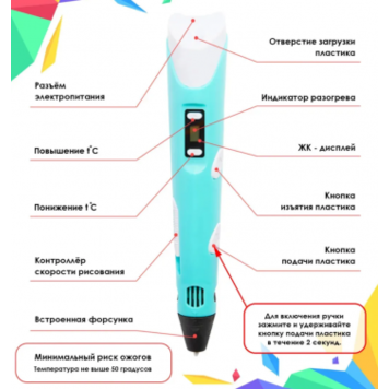 Регулировка скорости подачи пластика позволяет выбрать толщину штрихов, что очень важно при работе со сложными объектами или при создании художественных рисунков. Энергосбережение. После 5 минут простоя 3D-ручка автоматически отключается. За счет этого снижается расход электроэнергии, а также уменьшается вероятность случайного возгорания при контактах с другими предметами.